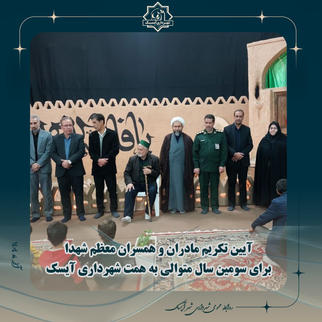 🔻به گزارش روابط عمومی شهرداری آیسک آیین پاسداشت و تکریم مقام مادران و همسران معظم شه✨دا برای سومین سال متوالی، به همت شهرداری و شورای اسلامی شهر آیسک و همزمان با شام وفات حضرت امالبنین(س)، با حضور خانوادههای معظم شه✨دا، حضور ارزشمند سرکار خانم مهندس نخعی مدیرکل دفتر امور شهری و شوراهای استانداری خراسان جنوبی و کارشناسان محترم، جناب مهندس عدل فرماندار محترم شهرستان و دیگر مسئولان شهرستان در گلزار مطهر شهدای آیسک برگزار شد.