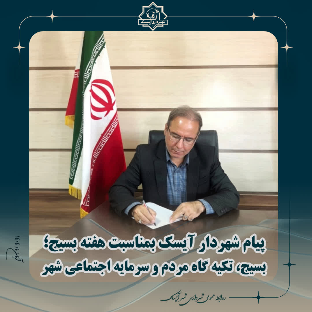🔻اینجانب، ضمن گرامیداشت این ایام پرافتخار، هفته بسیج را به مردم شریف و عزیز شهر آیسک تبریک عرض مینمایم و توفیق روزافزون همگان را در مسیر خدمت و پیشرفت این شهر سربلند از خداوند متعال خواستارم.