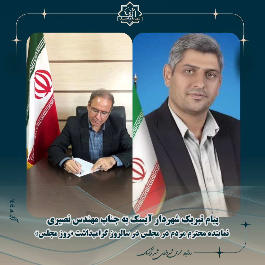اینجانب این روز ارزشمند را به جناب مهندس نصیری نماینده محترم مردم شریف شهرستانهای فردوس، سرایان، بشرویه و طبس و عشق آباد در مجلس شورای اسلامی صمیمانه تبریک عرض میکنم و از تلاشهای دلسوزانه جنابعالی در پیگیری مطالبات مردمی، حمایت از برنامههای توسعهای منطقه و همراهی با مدیریتهای شهری بهویژه در شهر آیسک قدردانی مینمایم.