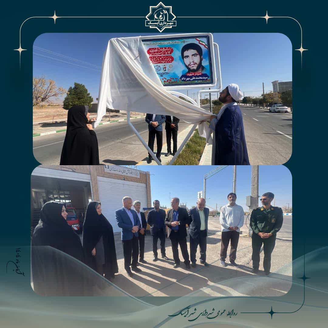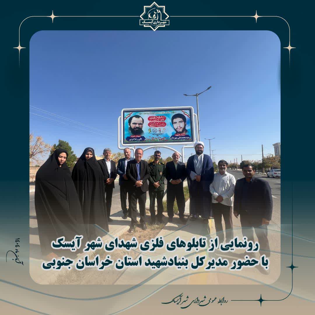 در آستانه برگزاری کنگره ۲۴۰۰ شهید استان خراسان جنوبی، آیین رونمایی از تابلوهای چاپ فلز شهدای والامقام شهر آیسک در بلوار اصلی شهر با حضور مدیرکل بنیاد شهید و امور ایثارگران استان، شهردار آیسک و اعضای شورای اسلامی شهر برگزار شد.