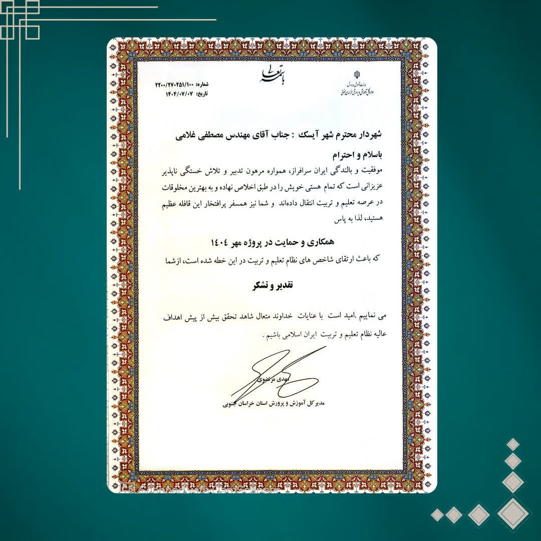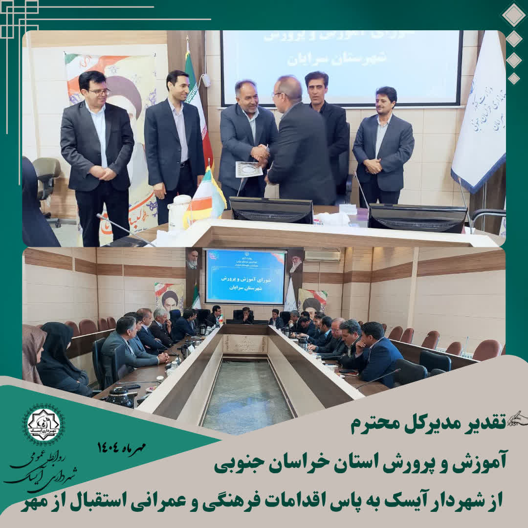 🔻در جلسه شورای آموزش و پرورش شهرستان سرایان، با حضور مهدی مرتضوی مدیرکل آموزش و پرورش استان خراسان جنوبی و محمود خسروانی مشاور مدیرکل، از مهندس مصطفی غلامی، شهردار آیسک به پاس همراهی و حمایتهای شایسته در اجرای اقدامات فرهنگی و عمرانی به مناسبت آغاز سال تحصیلی و بازگشایی مدارس، تقدیر به عمل آمد.