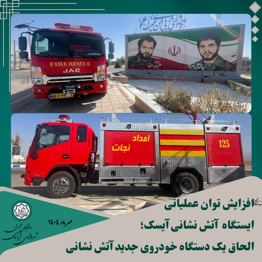 🔻به همت شهرداری و شورای اسلامی شهر آیسک و با حمایتهای سازمان شهرداریها و دهیاریهای کشور و استانداری خراسان جنوبی، یک دستگاه خودروی جدید آتشنشانی ۸/۵ تن به ارزش ۶۵ میلیارد ریال به ناوگان ایمنی و خدمات شهری آیسک افزوده شد.
