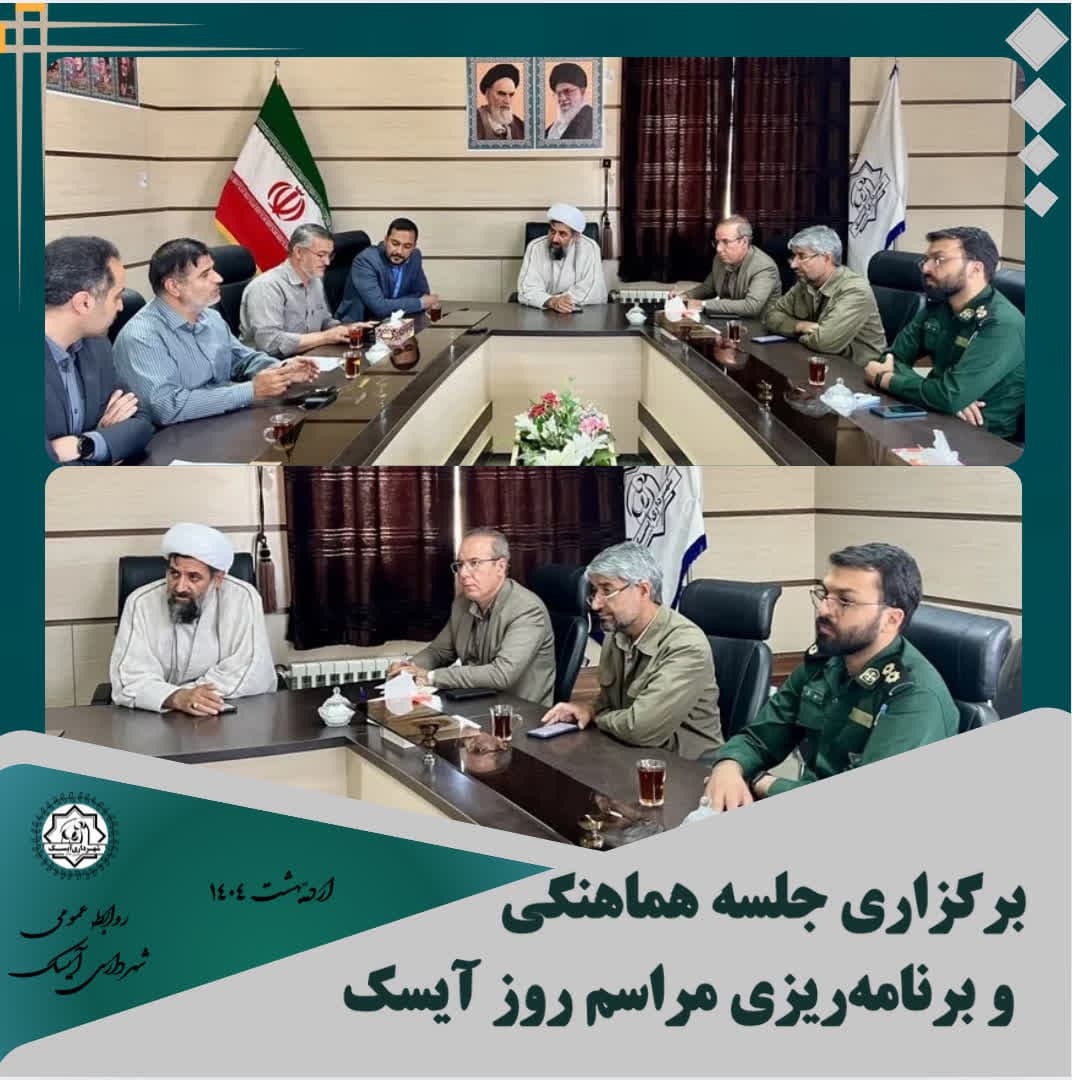 🔻در آستانه فرا رسیدن روز آیسک، جلسهای با حضور امامجمعه محترم آیسک، بخشدار، شهردار، اعضای شورای اسلامی شهر و جمعی از مسئولان ادارات و نهادهای فرهنگی و اجرایی در محل شهرداری برگزار شد.