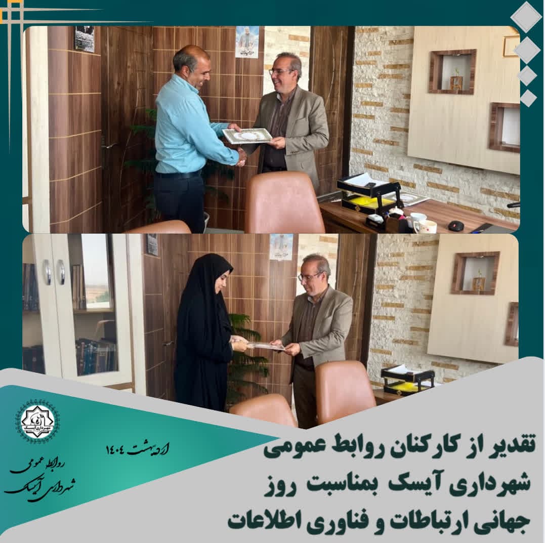 🔻همزمان با ۲۷ اردیبهشتماه، روز جهانی روابطعمومی و ارتباطات، طی مراسمی شهردار آیسک با اهدای لوح سپاس، از زحمات و تلاشهای ارزنده دو تن از مسئولان روابطعمومی شهرداری در عرصه اطلاعرسانی، تعامل با شهروندان، پوشش اخبار و مستندسازی فعالیتهای مدیریت شهری قدردانی کرد.