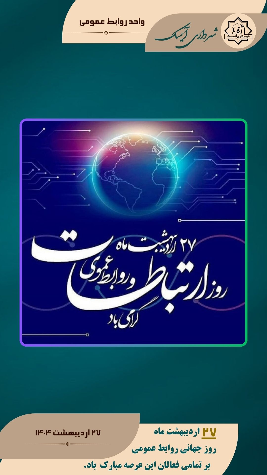 🔻 «مهندس غلامی» شهردار آیسک ضمن تبریک این روز به فعالان حوزه روابطعمومی، روابطعمومی را رکن اساسی و پل ارتباطی میان مدیریت شهری و مردم عنوان کرد و بر نقش این حوزه در ارتقاء شفافیت، پاسخگویی، اعتمادسازی و بهبود کیفیت ارتباطات تأکید نمود.